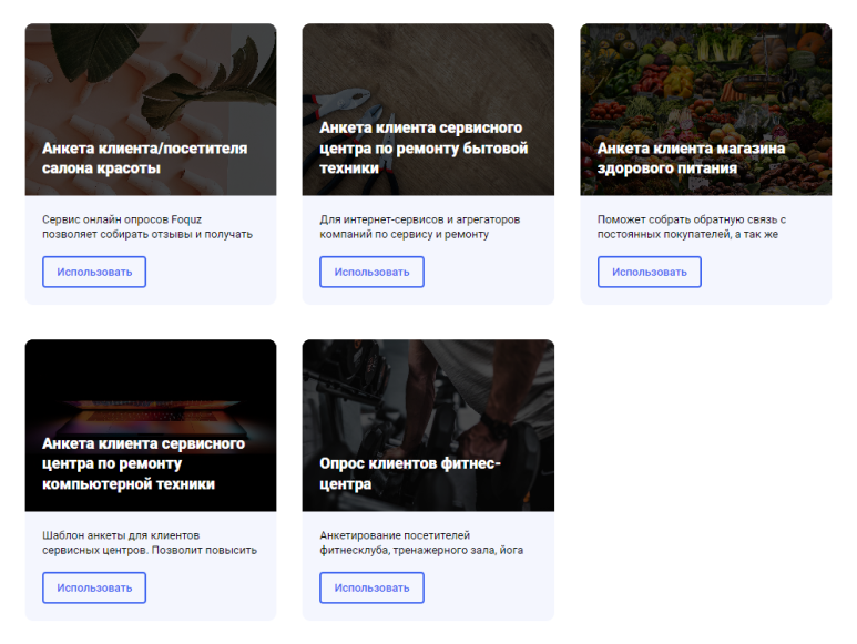 Несомненное преимущество платформы онлайн опросов Foquz – база готовых шаблонов, содержащая примеры опросников, составленные опытными маркетологами. Система содержит опросники для разных ниш и направлений бизнеса, в ней есть готовые примеры под самые разные цели и задачи.