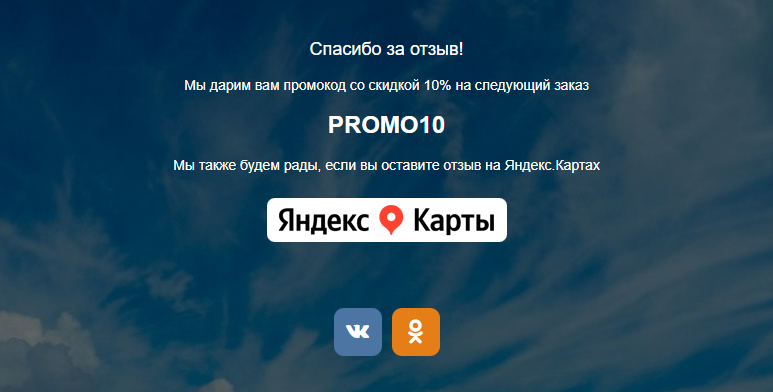 После завершения опроса респонденту показывается закрывающая страница. Зачастую компания просто благодарит покупателя за заполнение анкеты, однако возможности этой страницы намного шире.