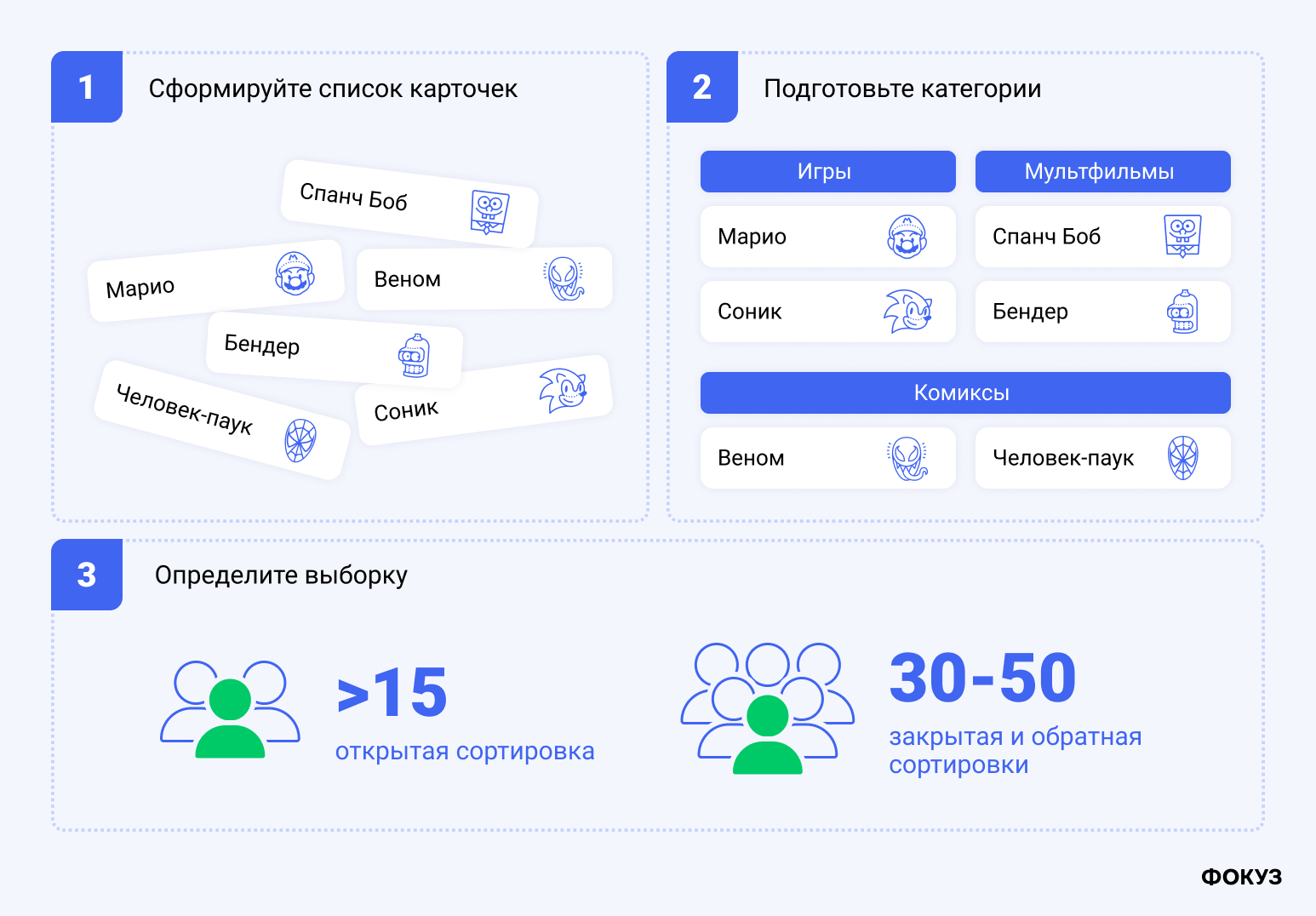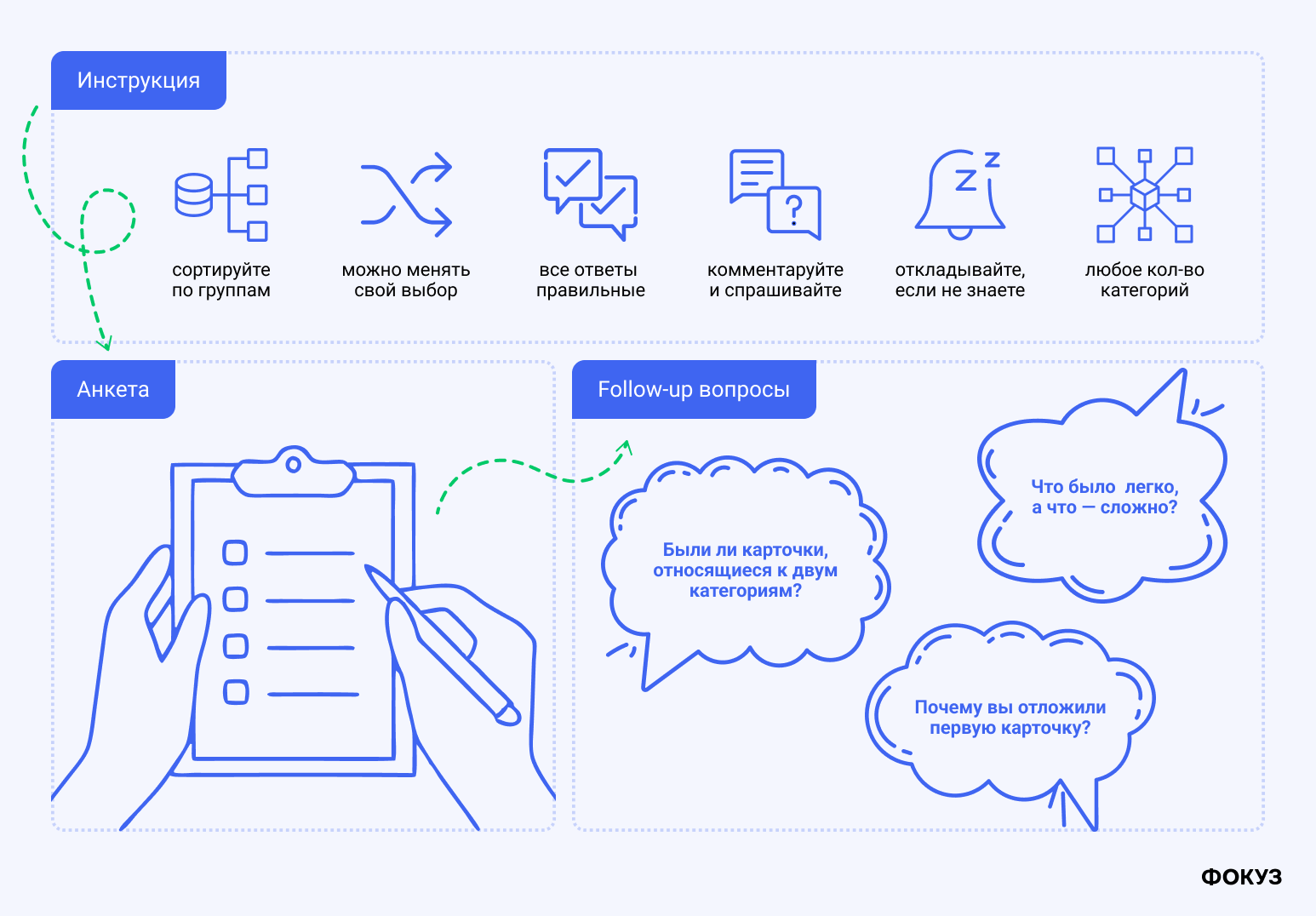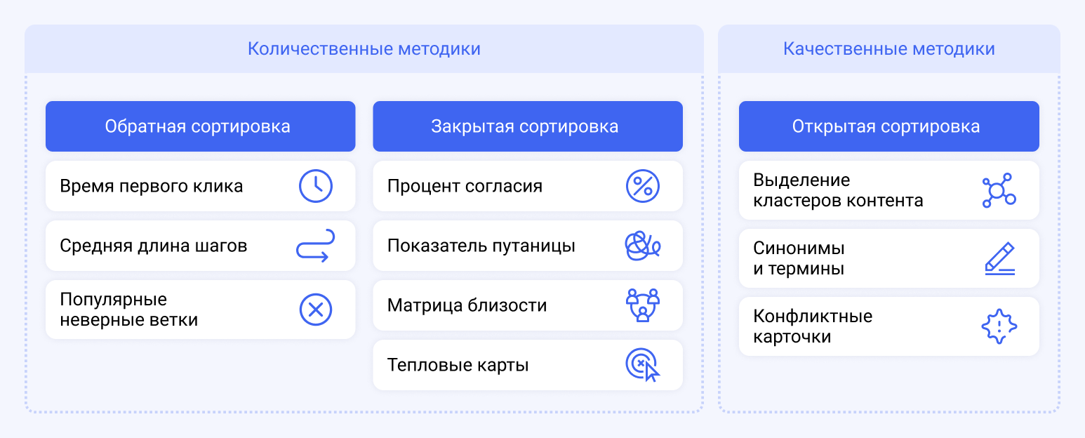 «Что было особенно легко, а что — сложно? Почему?» — если респонденты отмечают, что сортировка была слишком лёгкой, стоит проверить, нет ли в карточках скрытых подсказок (одинаковые корни, служебные слова). Если же они говорят, что это было сложно, то важно уточнить: не была ли инструкция запутанной, или же карточки/категории действительно плохо различимы для пользователей. В обоих случаях ответы дают исследователю подсказки о качестве материалов.