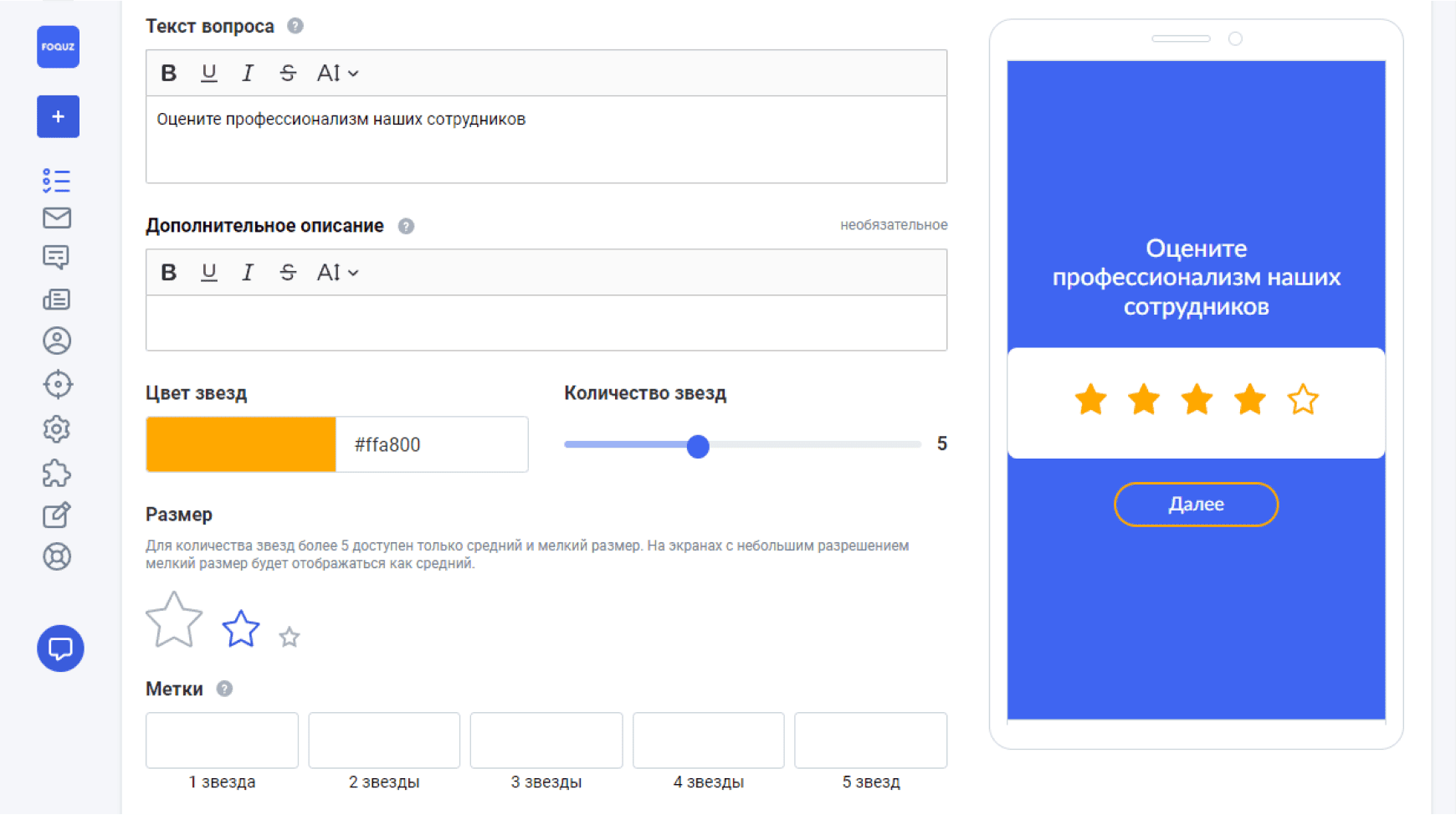 1. Создайте опрос в FOQUZ. Зарегистрируйтесь в личном кабинете и нажмите кнопку «Создать опрос» и выберите «Ручной». 2. Выберите тип вопрос «Звездный». В нём есть две вариации: стандартный и для вариантов (транзакционный). 3. Выполните настройки вопроса. Есть общие и индивидуальные настройки. Первые — название, текст и дополнительные описание вопроса. Вторые — цвет, размер и метки шкалы, размер звёзд.
