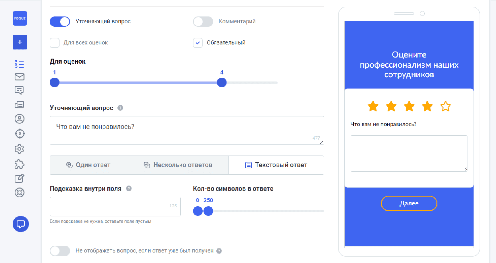 4. Добавьте дополнительные вопросы. Спросите что понравилось и что стоит улучшить с помощью вопросов типа «Текстовый ответ», либо опции «Уточняющий вопрос».