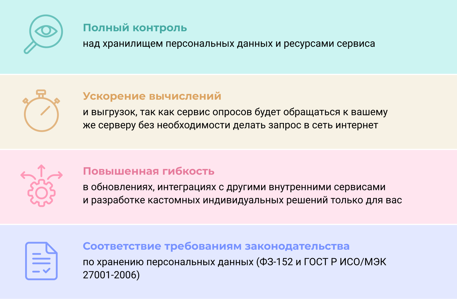 По итогу самыми безопасными являются in-house и on-premise решения. Первые имеет смысл разрабатывать, если у вас простые и однотипные опросы, но в случае, когда вам нужна возможность проводить разноплановые исследования, on-premise становится оптимальным. Поэтому дальше поговорим о нем подробнее.