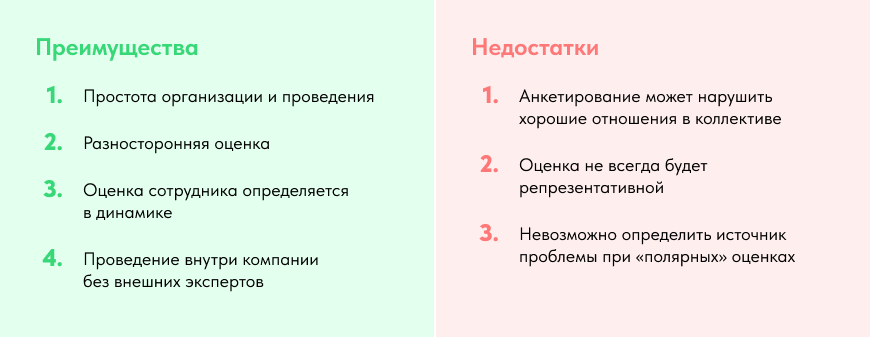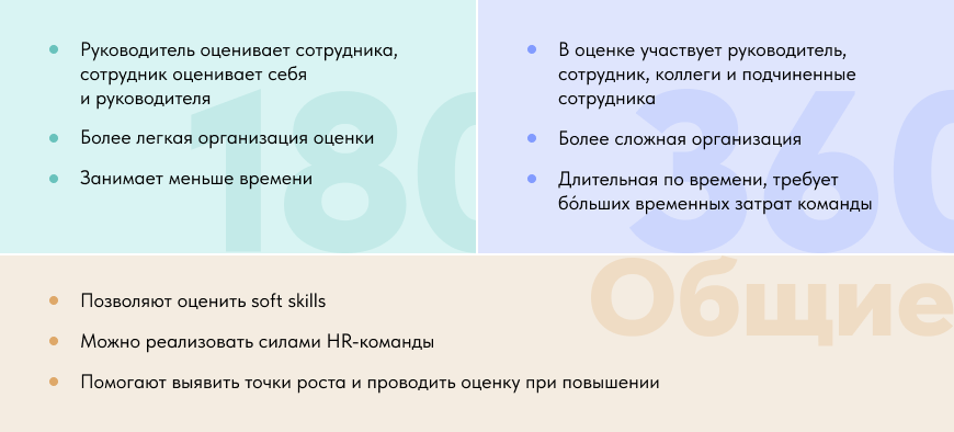 Оценка «90 градусов» включает оценку со стороны руководства, «180 градусов» — от руководителя и сотрудника, «270 градусов» — от руководства, сотрудника и коллег, «360 градусов» — от руководства, коллег, сотрудника и клиентов, а также «540» и «720 градусов» — от других участников процесса, например, партнеров.