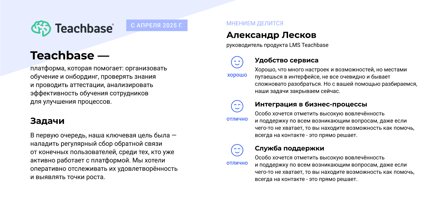 Наша задача в Teachbase была не просто собрать обратную связь, а сделать это системно, чтобы видеть динамику и понимать, как пользователи воспринимают платформу LMS на разных этапах взаимодействия.