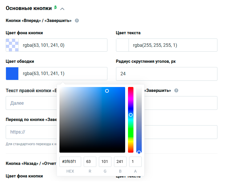 В этом блоке настраиваются цвета и тексты всех кнопок, которые могут быть в анкете. Все настройки кнопок собраны в три группы: