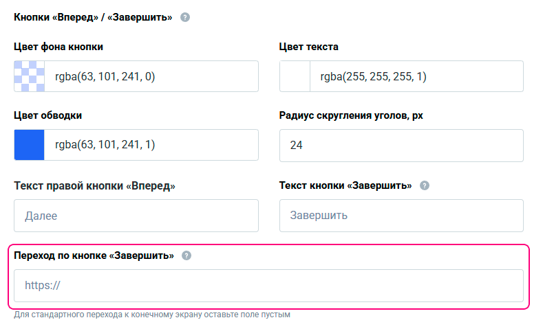 - в кнопку «Завершить» можно вставить ссылку. Если в ней будет URL, то при клике на неё респондент попадет на новую вкладку с вашей страницей вместо того, чтобы оказаться на конечном экране в опросе.