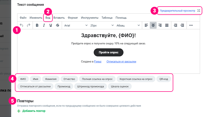 - также для шаблона можно настроить сценарии Повторов — автоматических повторных отправок, если по ссылке на анкету в предыдущем письме респондент не дал хотя бы один ответ.