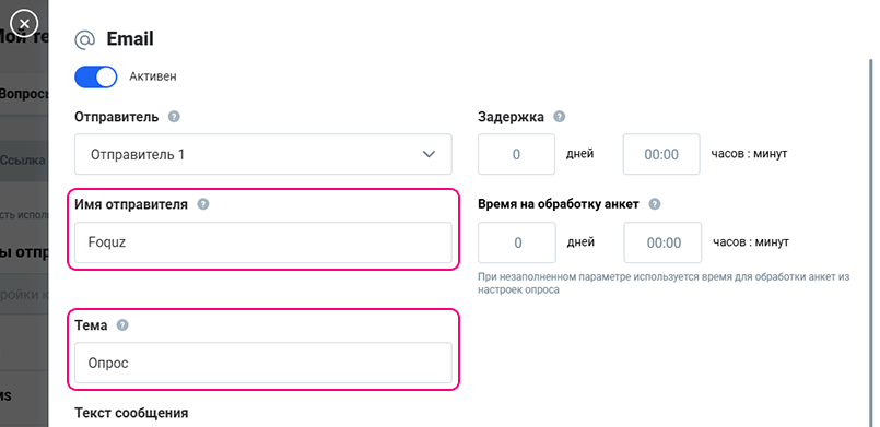 Помимо общих настроек канала связи нужно заполнить еще два поля: Имя отправителя и Тема, которые нужны, чтобы получатель письма видел их в данных отправителя (например, отправителем может быть FOQUZ с темой «Поддержка»).