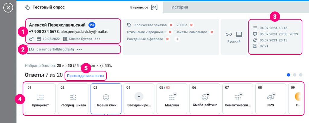 - вверху находятся данные контакта, который ответил на опрос;