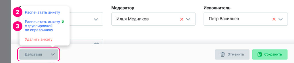 - анкету можно распечатать в PDF при клике на кнопку Действия;