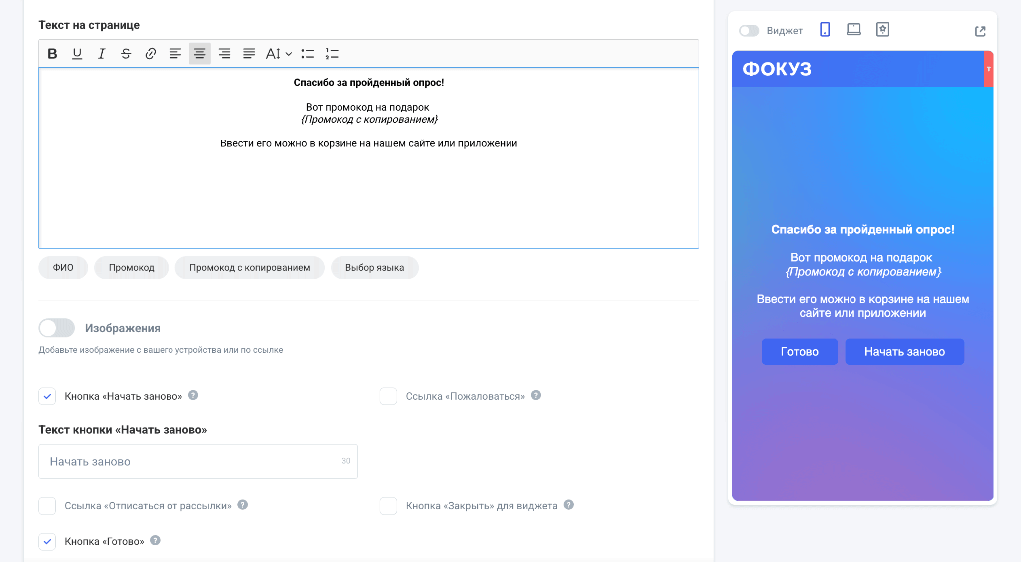 - Переменные: ФИО, Промокод, Промокод с копированием.