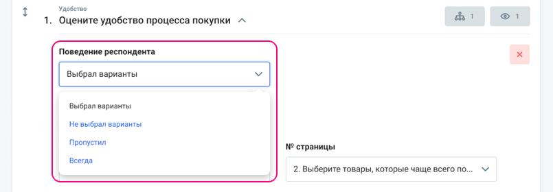 Для большинства типов вопросов доступны такие виды поведения респондента, по которым настраиваются условия: