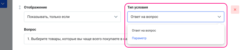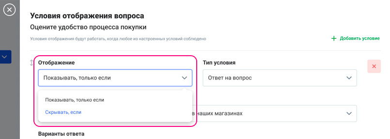 Важно: к одному вопросу можно настроить сразу несколько условий отображения. Все они будут работать по логике ИЛИ, то есть условие сработает, если выполнено хотя бы одно условие.
