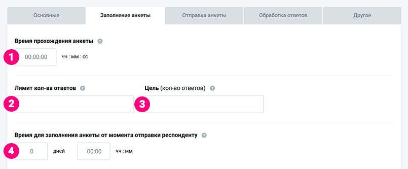 Заполнение анкеты — блок настроек для установки временны́х ограничений, лимита получаемых ответов и доступа к анкете по авторизации.