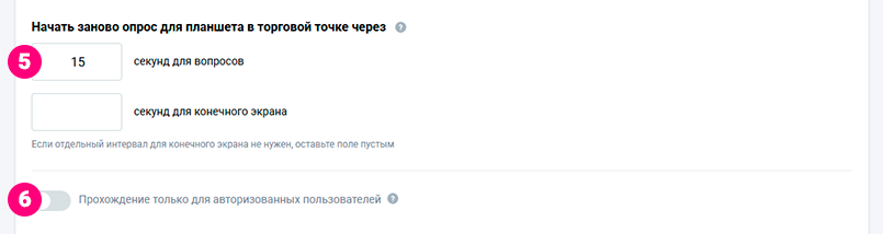 - Начать заново опрос для планшета в торговой точке через позволяет установить время бездействия, спустя которое текущая анкета будет автоматически сохраняться и открываться новая с самого начала.