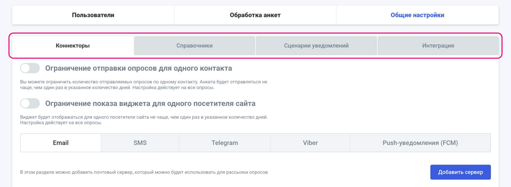 В разделе «Настройки» есть вкладка с «Общими настройками», которые позволяют добавить новые каналы связи для ваших пользователей, расширить возможности аналитики и обработки полученных ответов, а также получить информацию об интеграциях.