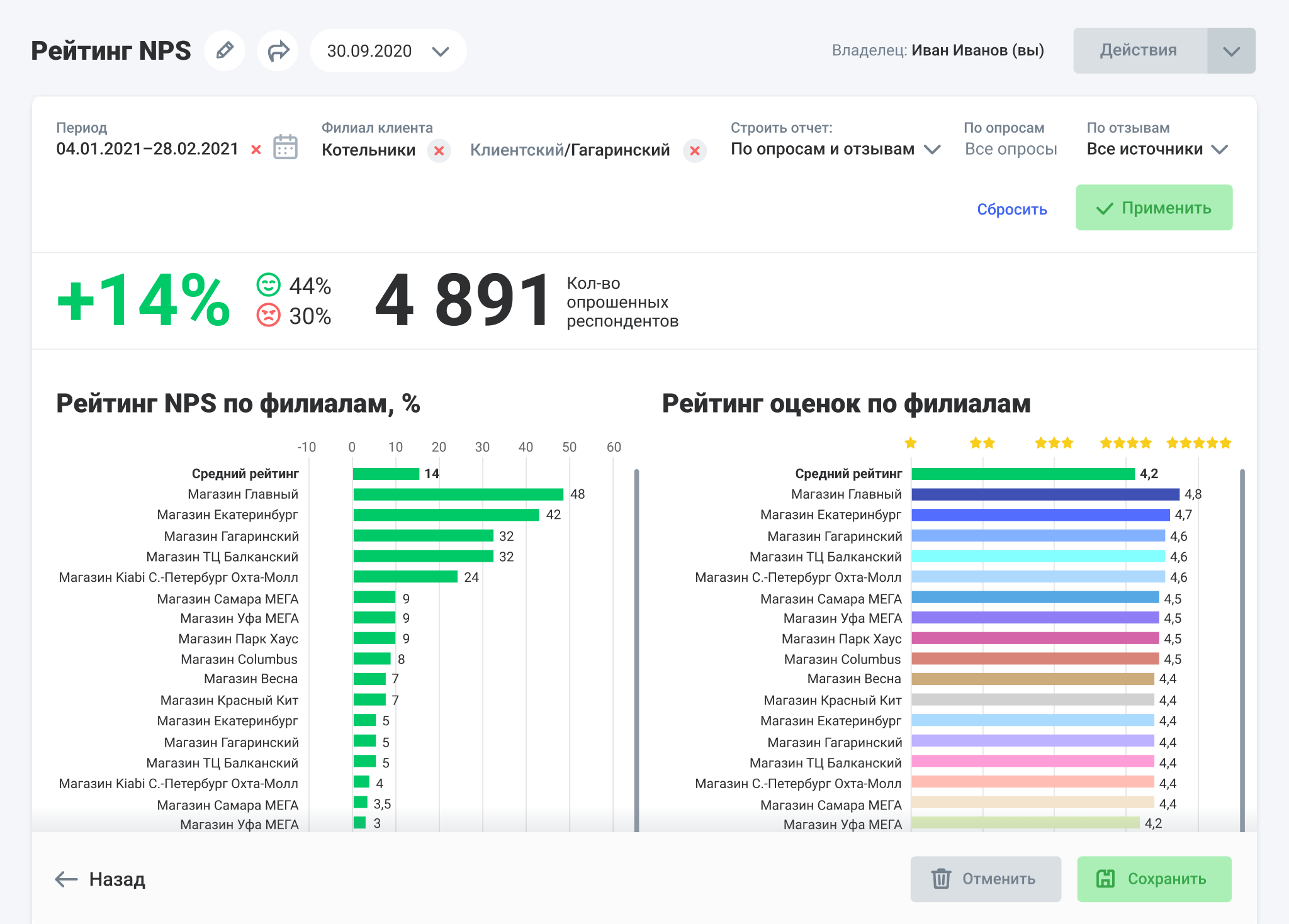 Отчет Рейтинг NPS позволяет сделать дашборд с рейтингом NPS, средними оценками и динамикой изменений. Для анализа можно выбрать: