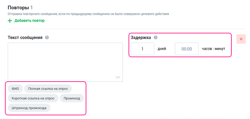 Обратите внимание, что задержка каждого повтора начинает отсчитываться с момента предыдущей отправки (основной рассылки или последнего отправленного повтора).