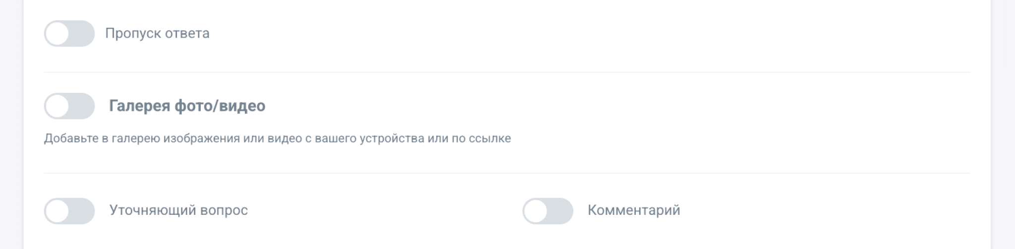 - Комментарий — открытое текстовое поле, куда респондент может добавить пояснения. Это поле показывается всегда, в отличие от уточняющего вопроса.
