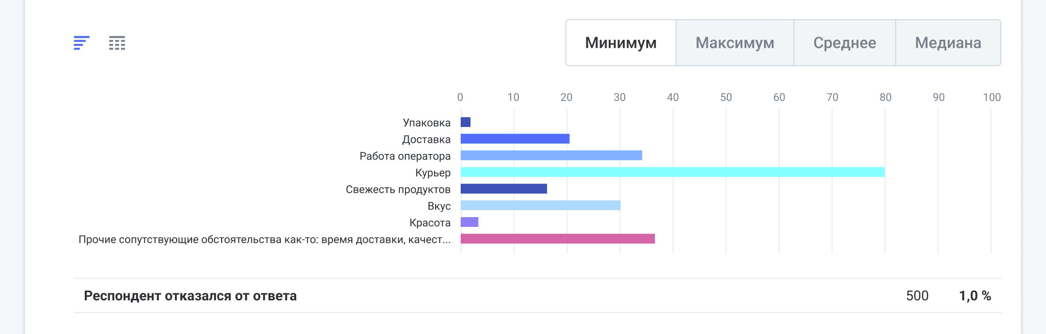 График распределительной шкалы в Статистике опроса отображается в виде столбчатой диаграммы или сводной таблицы с ответами.