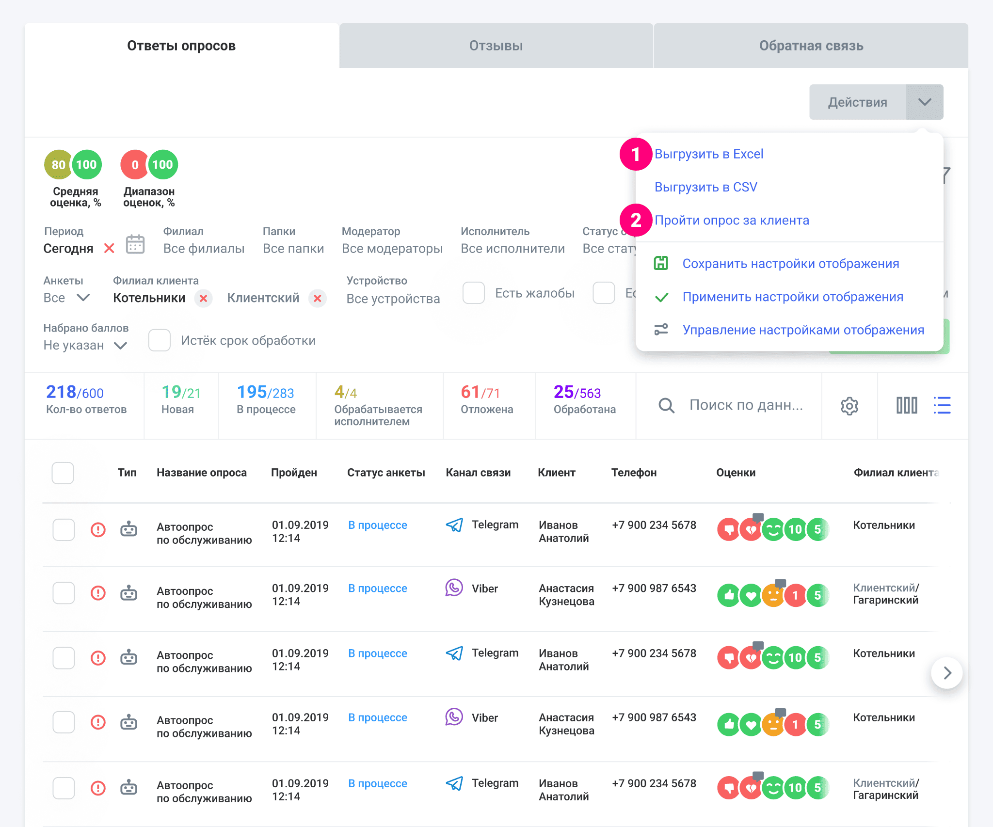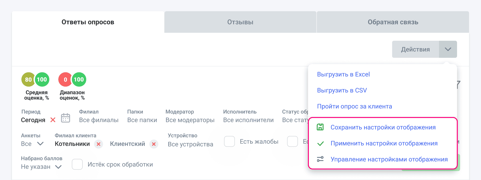 В разделе Ответы в одну таблицу собраны все ответы на доступные пользователю опросы. В ней можно фильтровать ответы, просматривать анкеты в отдельности, выгружать Excel и управлять отображением.