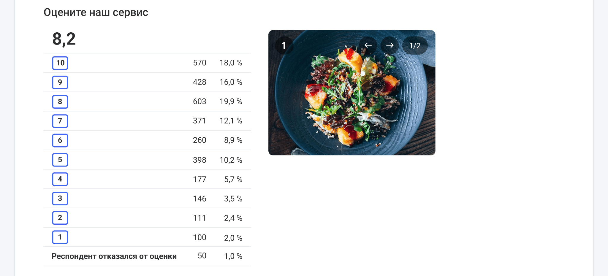 График рейтинга в Статистике опроса отображается в виде списка со средней оценкой, количеством ответов (номинально и в процентах). Также есть график с динамикой изменений оценок за период.