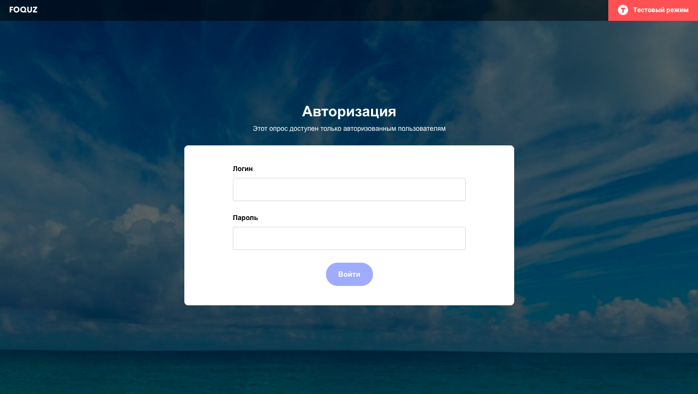 - После ввода логина и пароля, сервис производит проверку наличия доступа пользователя к опросу. Если логин и пароль введены верно, то респонденту будет доступно прохождение опроса. Если нет, то опрос не откроется.