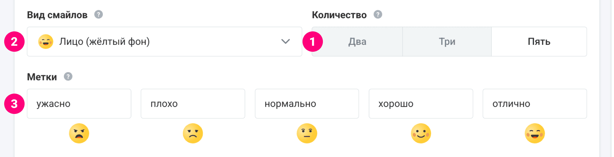 - Метки — подписи к смайлам, через которые можно добавить пояснения под каждым вариантом.