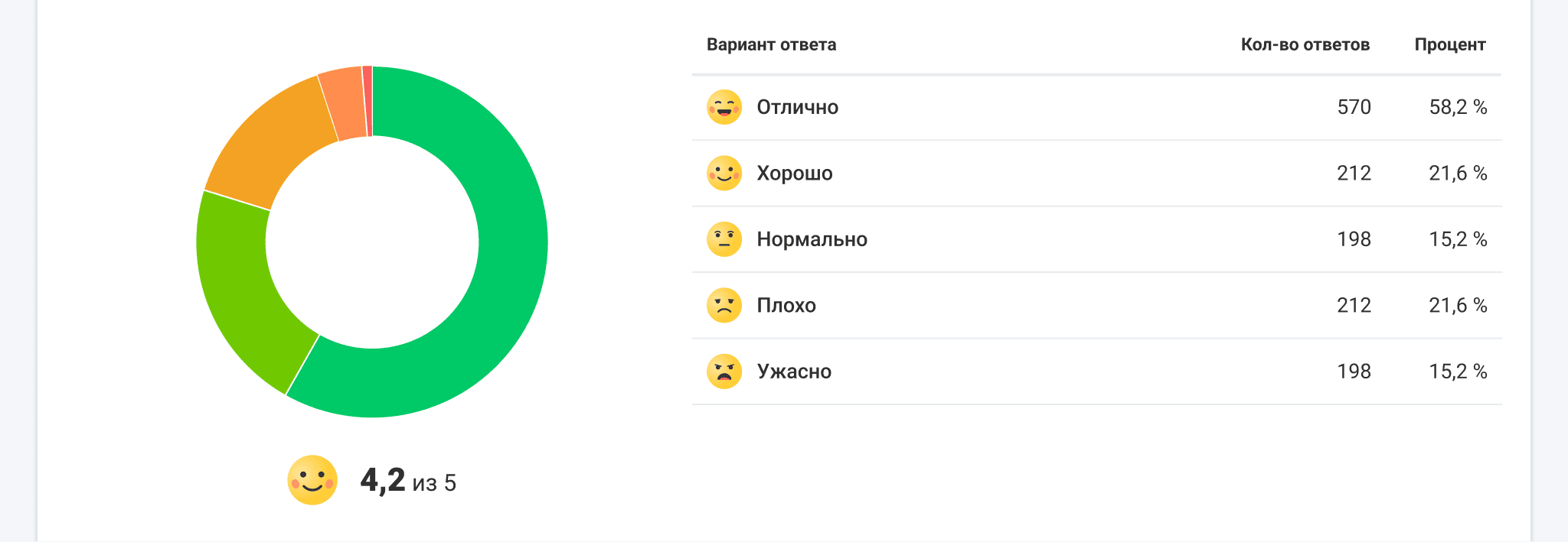 График смайл-рейтинга в Статистике опроса отображаются в виде столбчатой или круговой диаграммы на выбор. Также есть таблица со сводкой по оценкам.