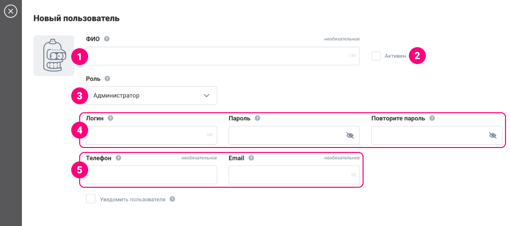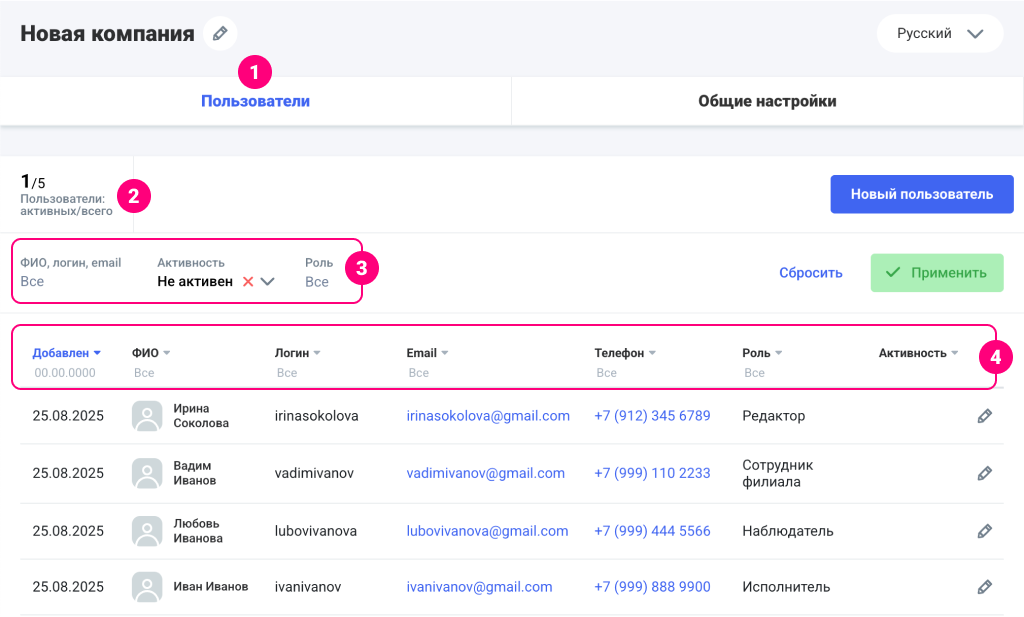 Создавать и редактировать новых пользователей могут только пользователи с ролью Администратора в разделе «Настройки», вкладка «Пользователи». Создание каждого пользователя состоит из: