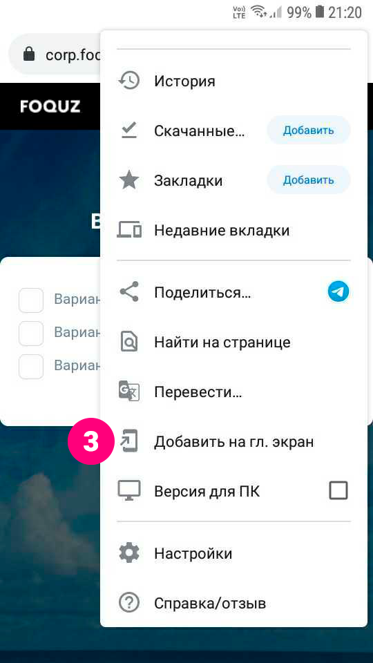 - выберите Добавить на главный экран на Android;