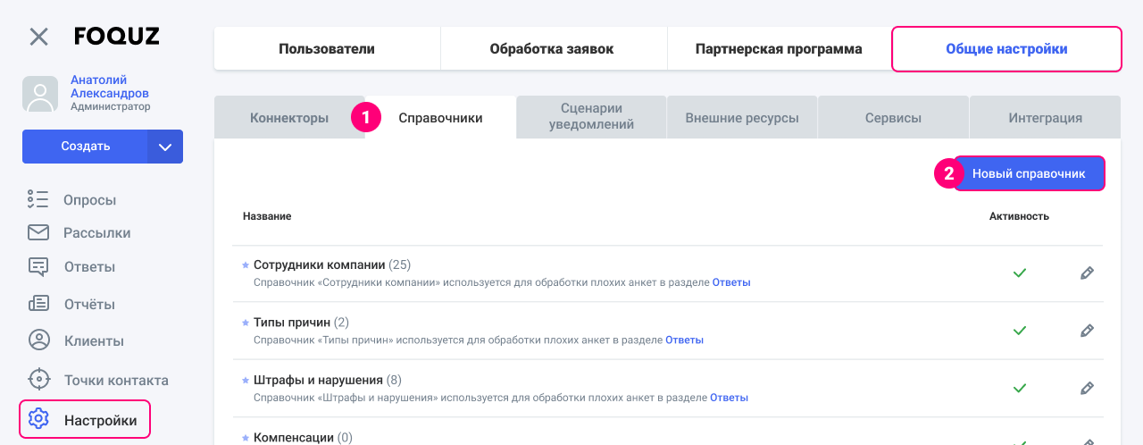 Пользовательские справочники — это пользовательские справочники, которые используются для создания типа вопроса Классификатор, тегирования вопросов, а также для возможности заполнить содержание вопроса из этого справочника.