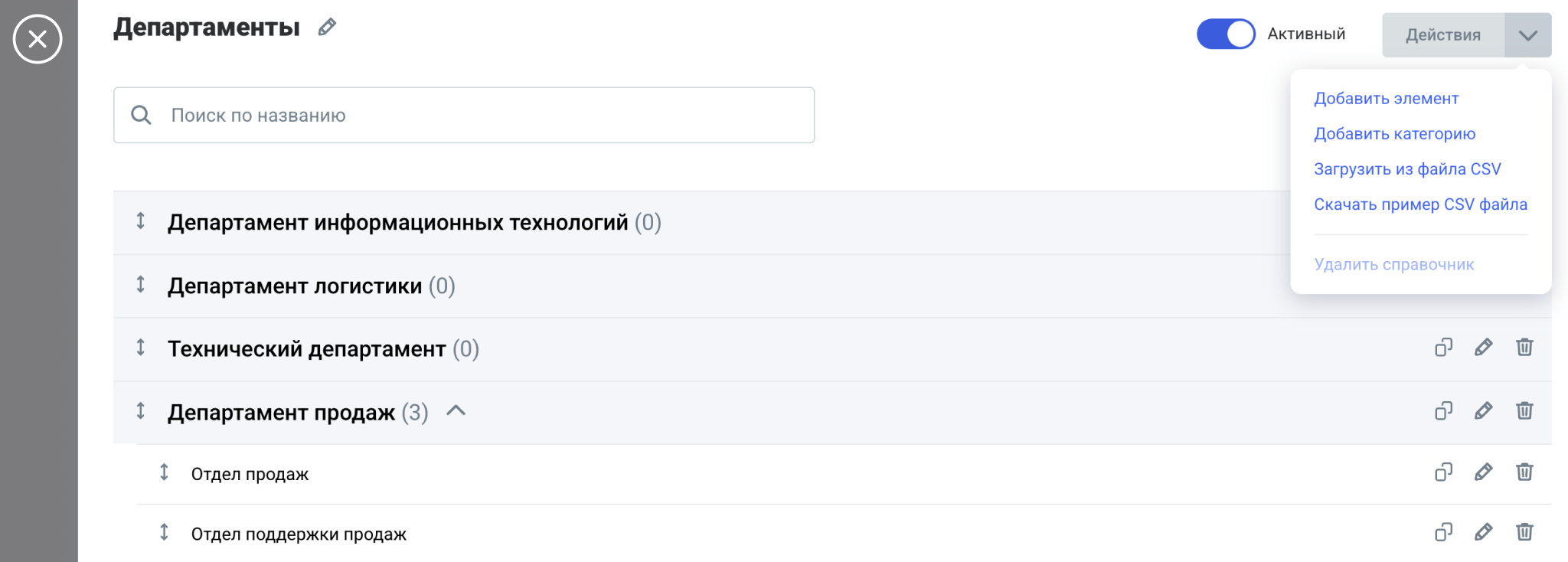 Такие справочники вы можете создавать вручную в интерфейсе или загружать из CSV файла (его пример также можно скачать). В любой момент все категории и элементы можно перемещать между собой через стрелочки или через редактирование.