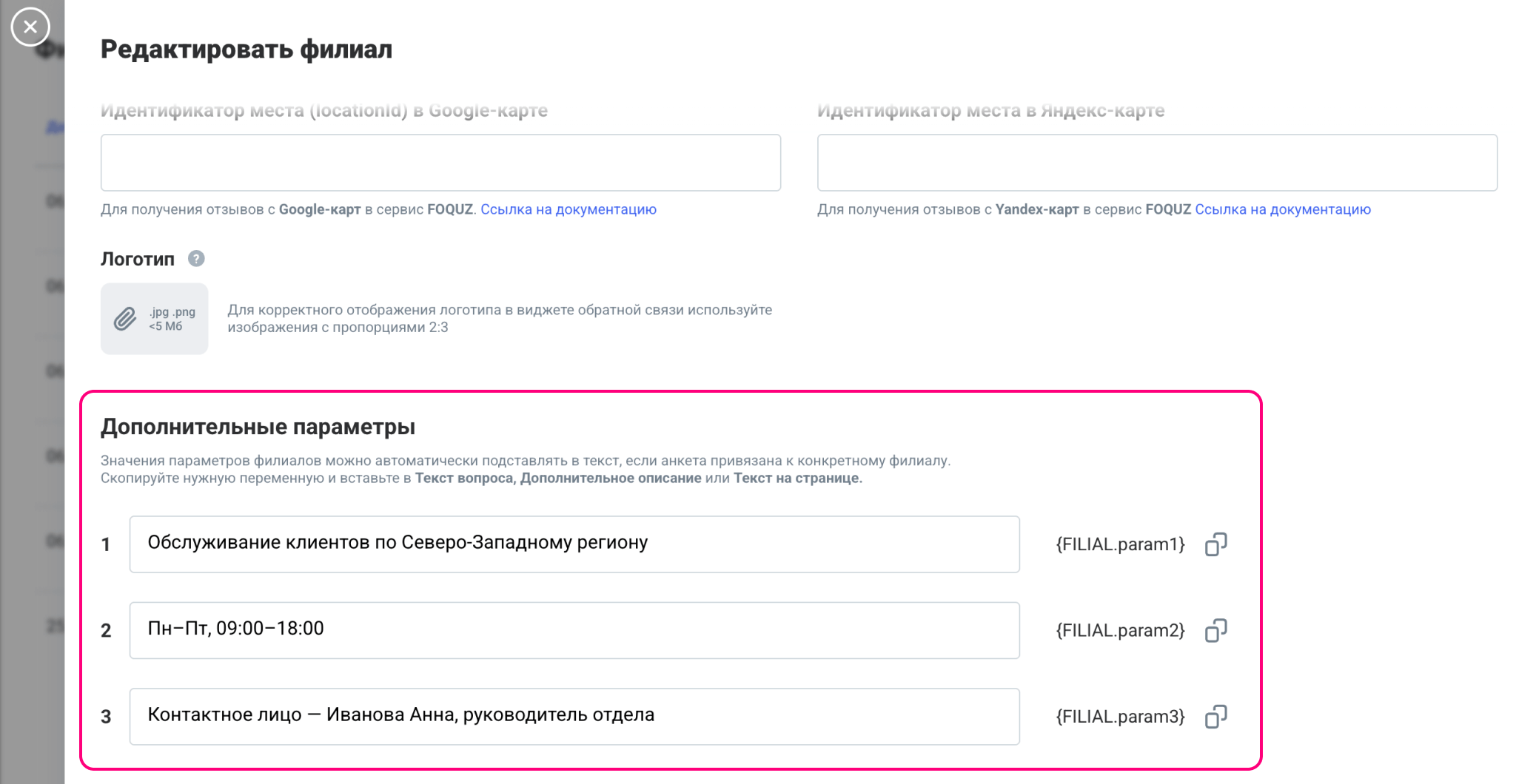 Каждому филиалу можно присвоить: название, категорию, адрес и логотип (используете в старом функционале виджетов), а также идентификатор филиала на Google- или Яндекс-картах.