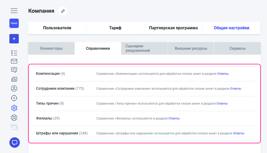 Справочники — это списки с элементами и категориями, которые используются для обработки и категоризации ответов, а также для создания вопросов.