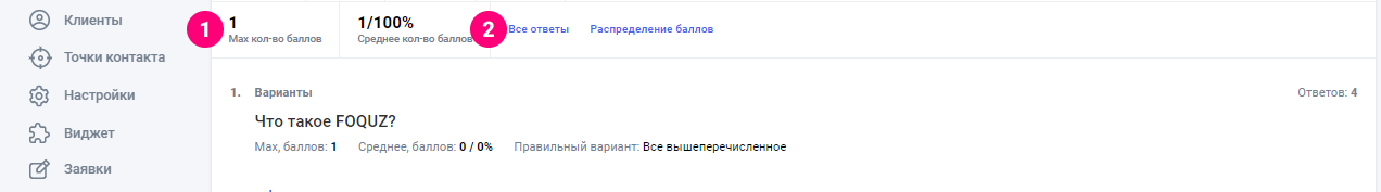 Если для опроса включена настройка Система баллов за ответ, то статистика будет расширенной: