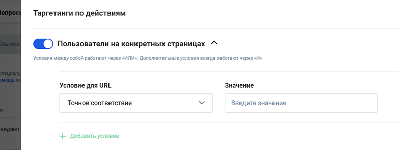 Опция Пользователи на конкретных страницах позволяет указать конкретные страницы и их состояния (с помощью хэшей (#) в URL), на которых необходимо показать этот виджет.
