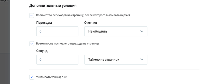 Время после последнего перехода на страницу устанавливает количество секунд нахождения на странице, при достижении которого показывает виджет.