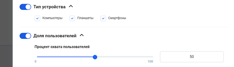 Таргетинг по типу устройства позволяет выбрать устройства, на которых этот опрос будет показываться: ПК, мобильные устройства и планшеты. Позволяет проводить UX/UI-исследования адаптивов интерфейса вашего сайта.