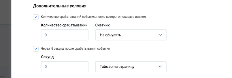 Через “N” секунд после срабатывания события устанавливает количество секунд нахождения на странице после получения события, при достижении которого нужно показать виджет.