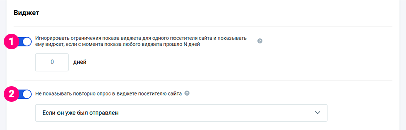 1.Опция Игнорировать ограничения показа виджета для одного клиента и показывать виджет клиенту, если с момента показа любого виджета прошло N дней выключает для этого опроса действие общей для всего аккаунта частоты отправки (подробнее в Политике контактов) и позволяет установить для этого опроса индивидуальную частоту.