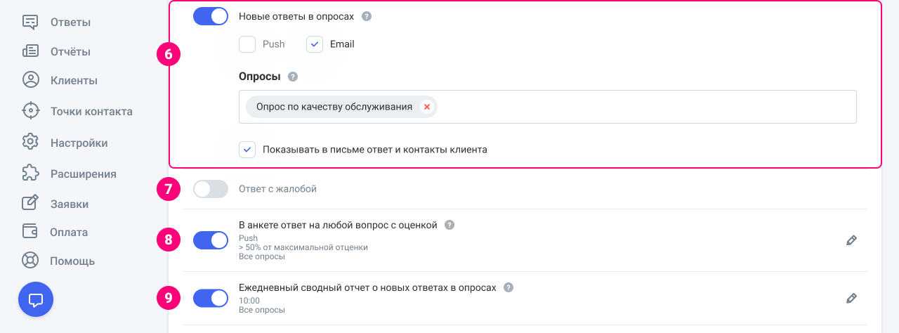 Подключите уведомления, чтобы не пропустить важные изменения в опросах. Во всех опциях уведомлений (кроме сводного отчета), можно настроить: