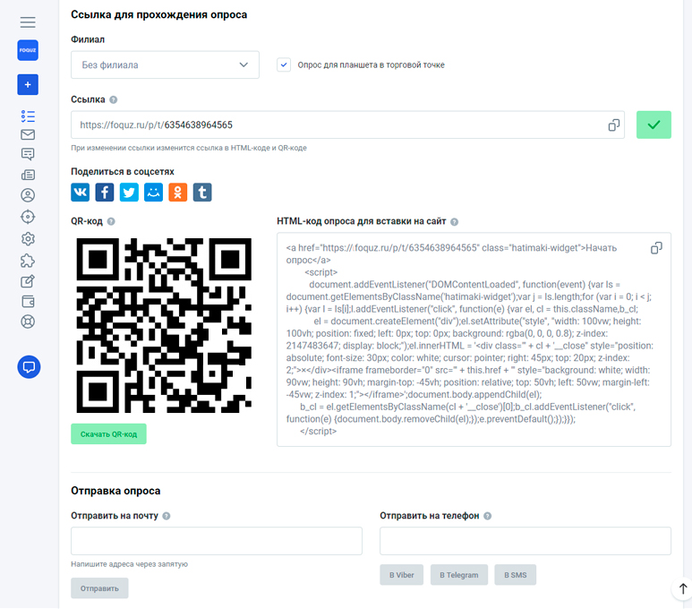 Чтобы охватить максимальное количество респондентов, необходимо обращаться к потребителям по разным каналам коммуникации. Платформа Foquz позволяет опрашивать покупателей, используя электронную почту, мессенджеры, смс-сообщения, push-уведомления, qr-коды. Опросник можно опубликовать на официальных страницах в соцсетях, встроить на сайт компании.